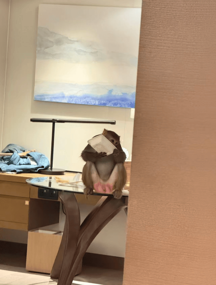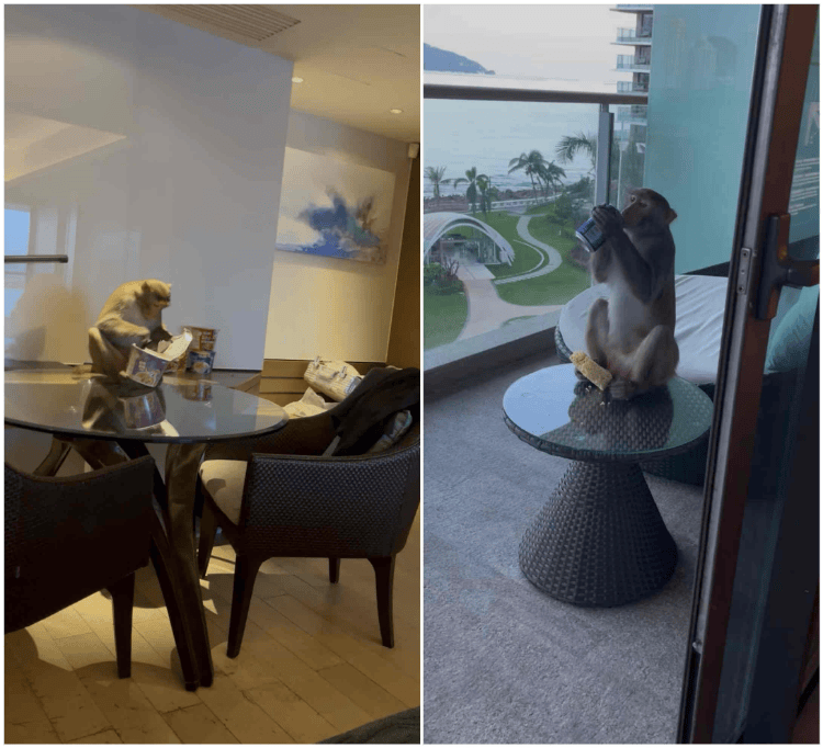 另一位游客“薯薯”也分享了“不速之客”进房间的经历。她称,当时自己住在该酒店东翼6楼,因阳台门未关,一只猕猴叼着空七喜罐大摇大摆走进房间,干吃方便面后自行开可乐解渴,逗留约半小时。她调侃原本的“海景房”变成了“猴景房”。酒店随后为她更换房间,并解释,这只猴子“把酒店当家了,只馋吃的,不攻击人”。